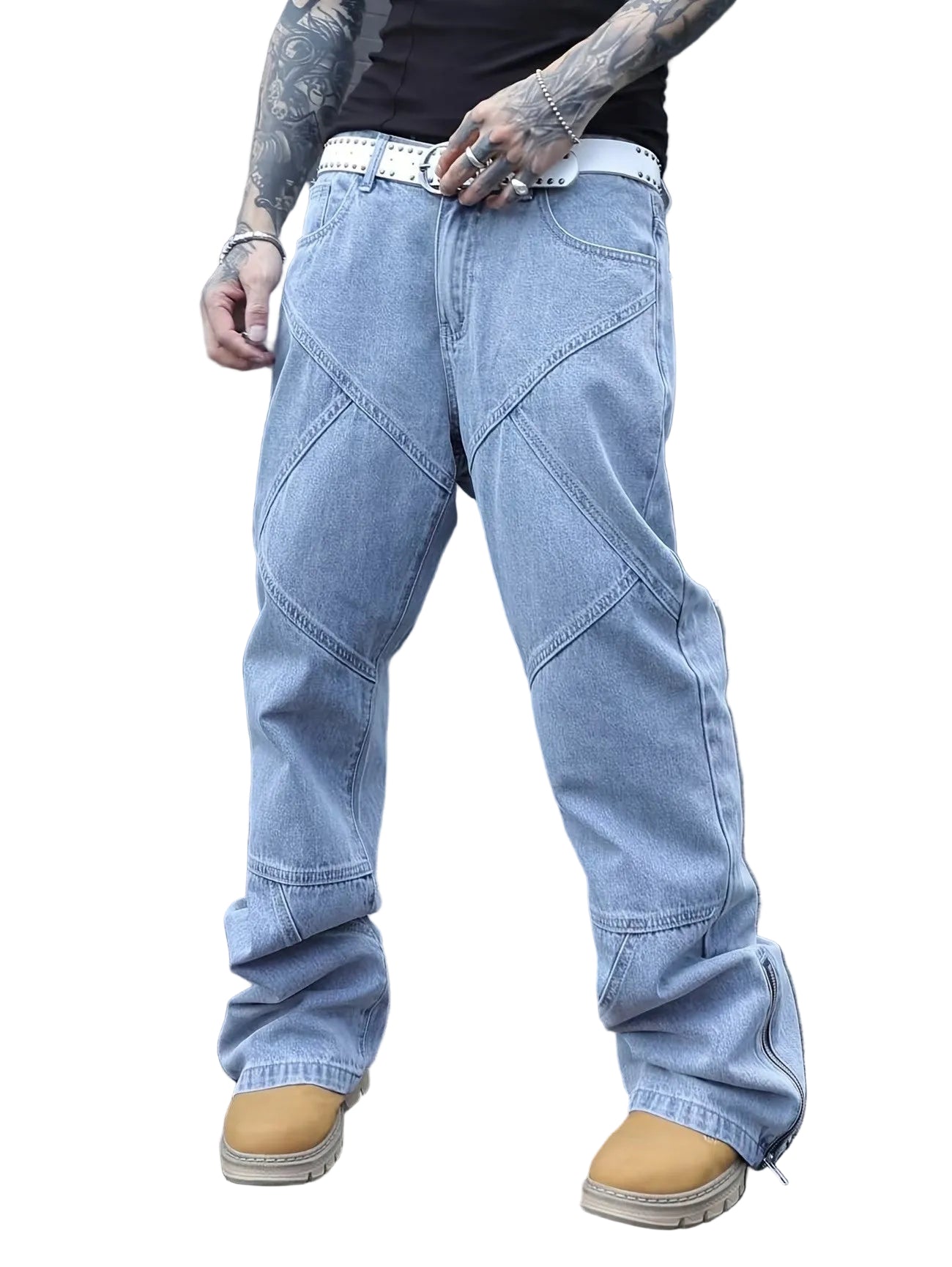 - Geometriska framsömmar: Framsidan av byxorna har diagonala sömmar. Sömmarna bildar ett geometriskt mönster över lår och knän.