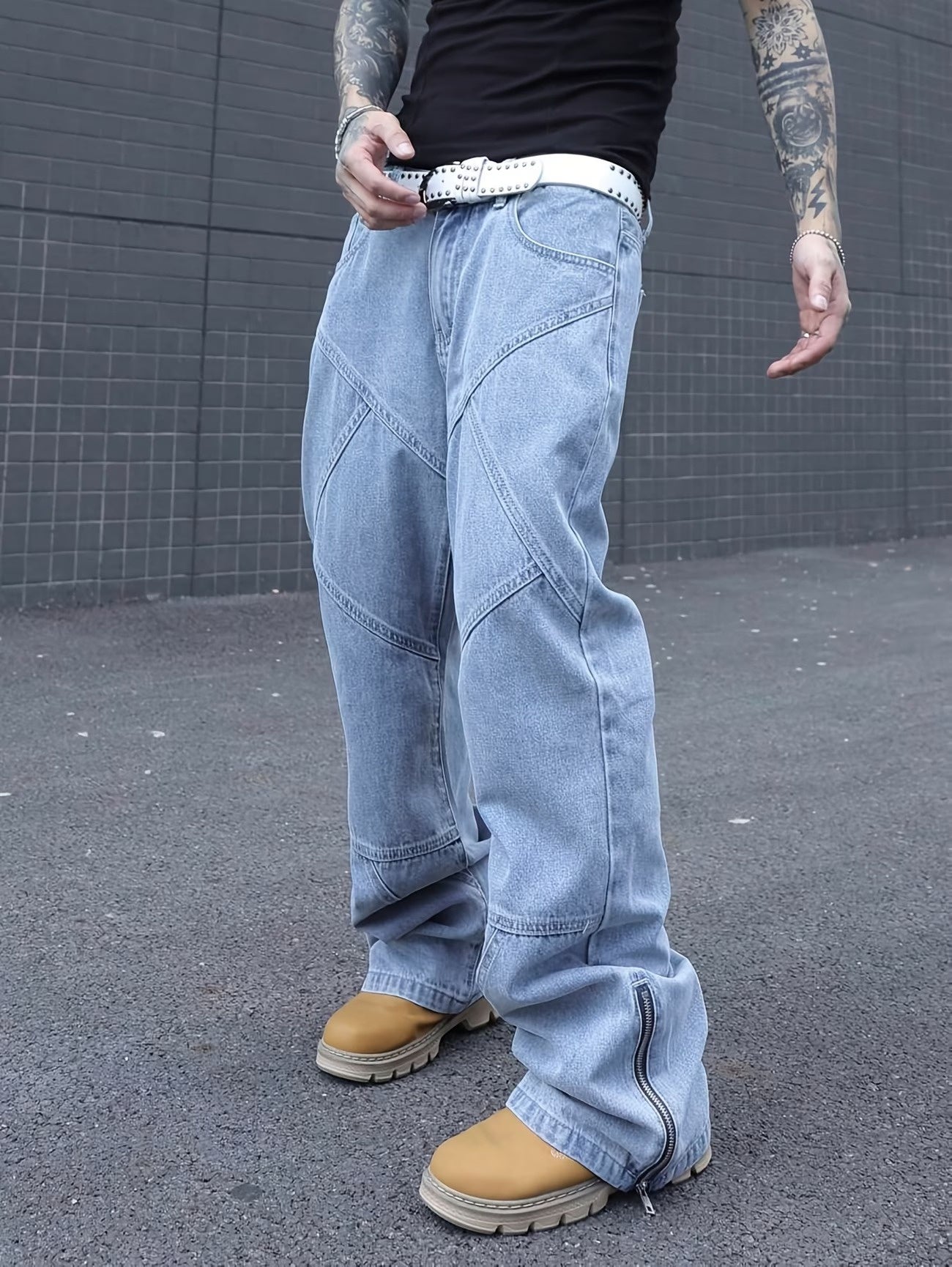 Byxor med geometriska sömmar och sidofickor med dragkedja